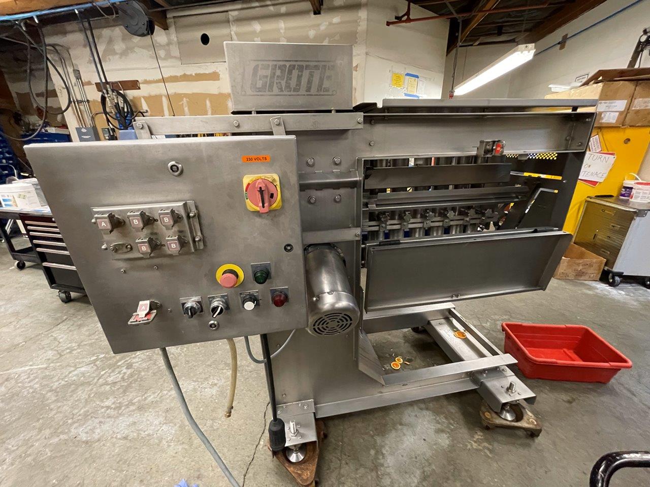 Used Grote FPS-1000 fruit and vegetable slicer. Manufacturer: Grote Model: FPS-1000 The machine was inspected late spring 2023. It comes with a takeaway belt conveyor; some extra tubes are also available. The system works and is in excellent condition. It is sold in As-In, Where-Is Condition.
