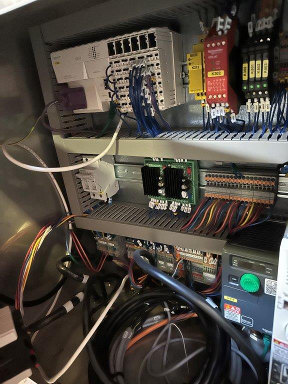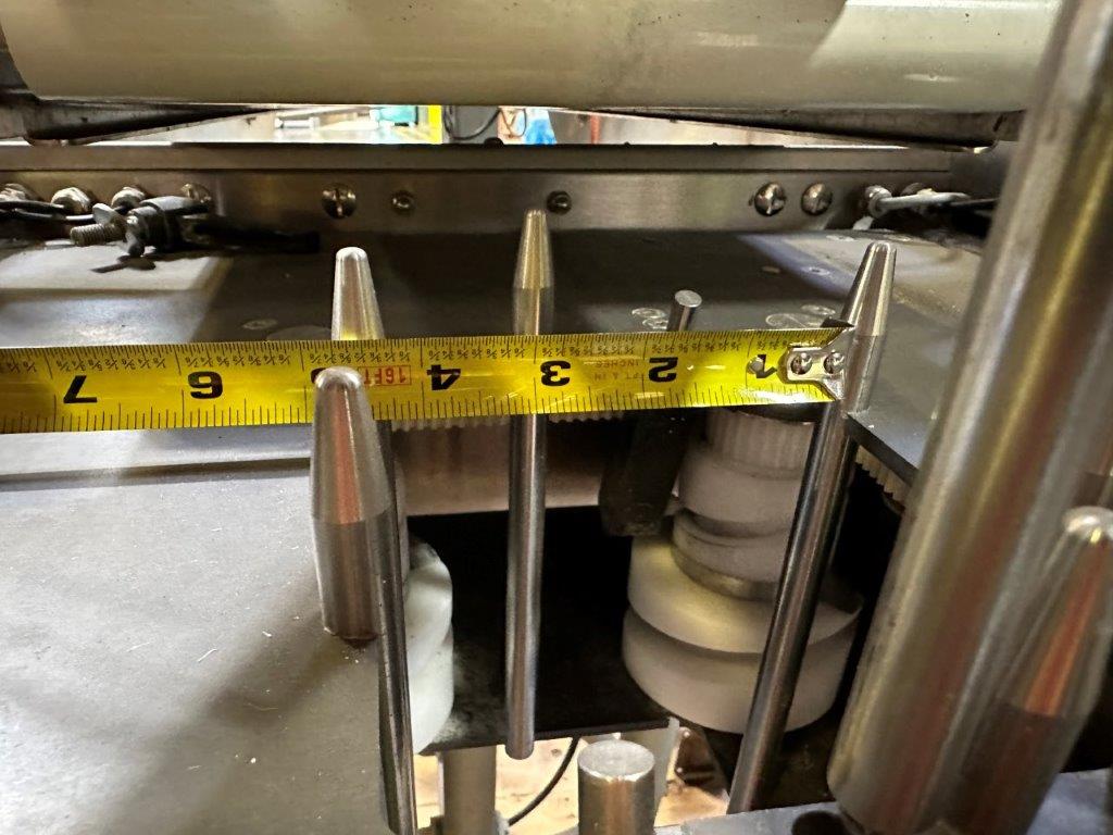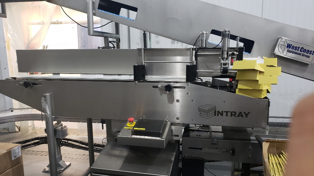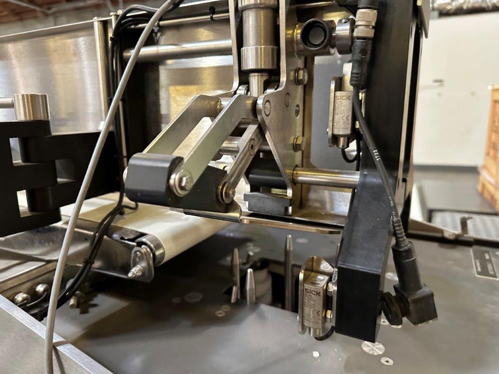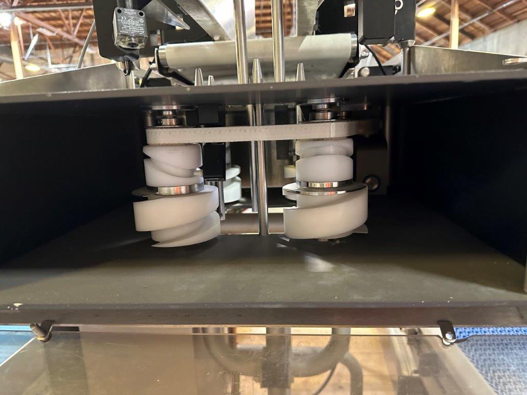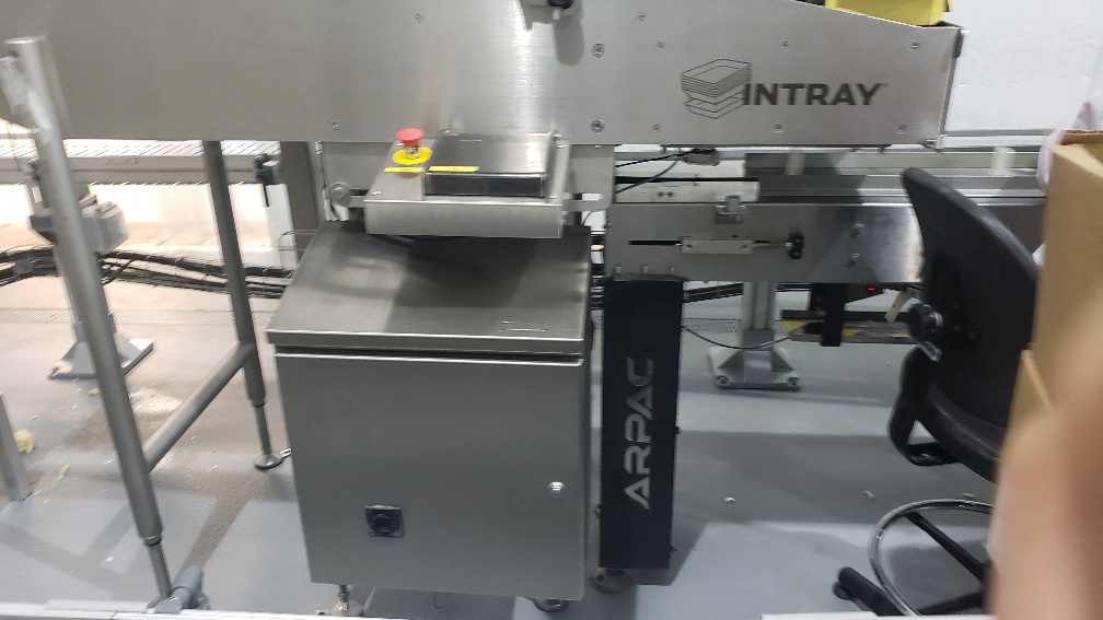 The machine was last dispensing trays onto a flow wrapper table (table not available). The machine has a Schneider HMI and Schneider Electric Lexium AC Servo Drive. Machine was removed from production in late 2022. The machine is rated up to 200 trays per minute, tray depending.