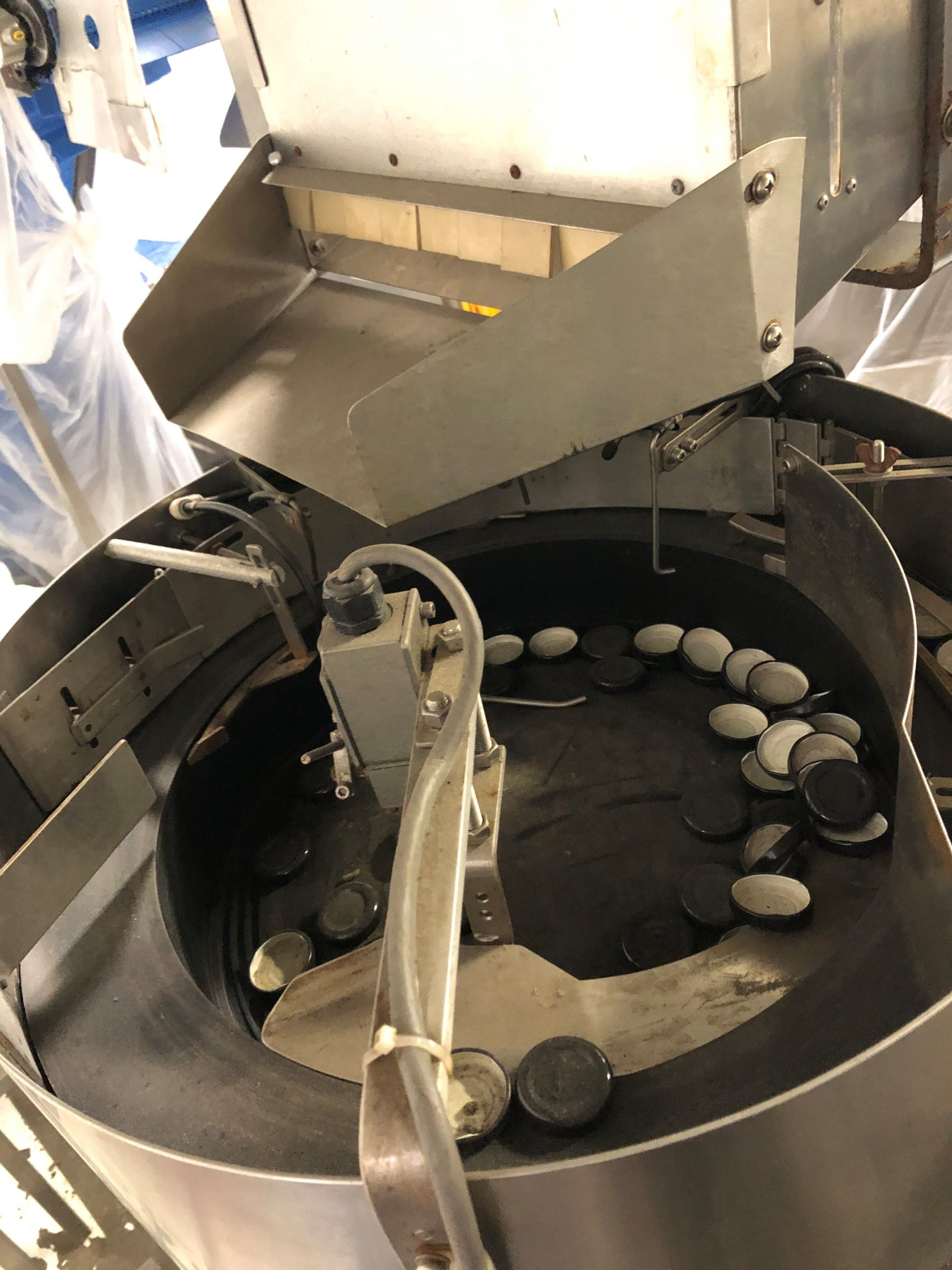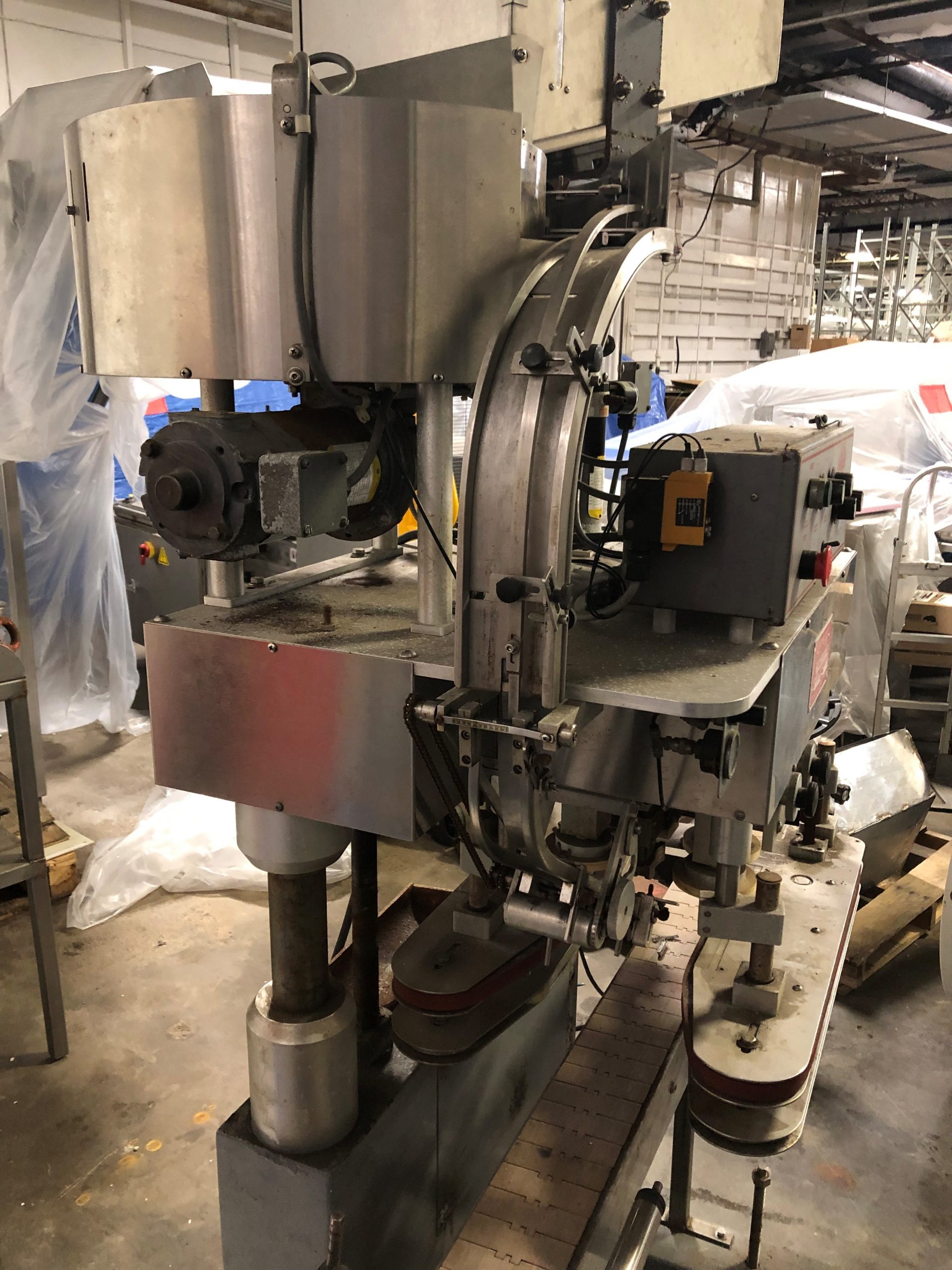 This capper is equipped with 4 chuck spindle, top mount cap feeder with vibratory hopper attachment and conveyor.