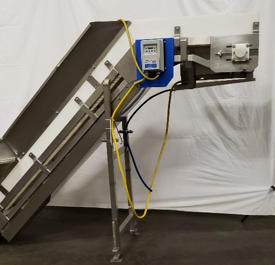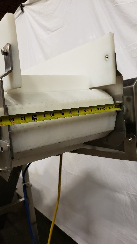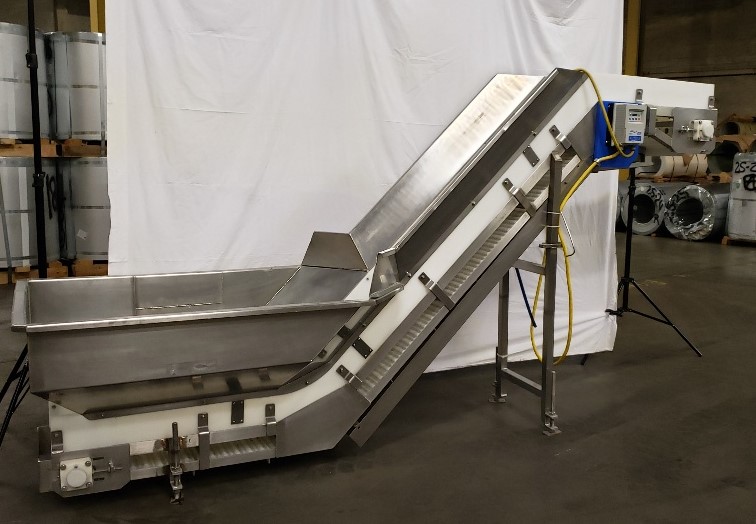 Used Marel Incline Z style conveyor with receiving hopper and VFD to control the speed. Hopper opening: 48” L x 35” W x 24” H (from the top of the belt). Discharge is currently 62”H but is adjustable Belt width: 14” Cleats 12” W x 2”H