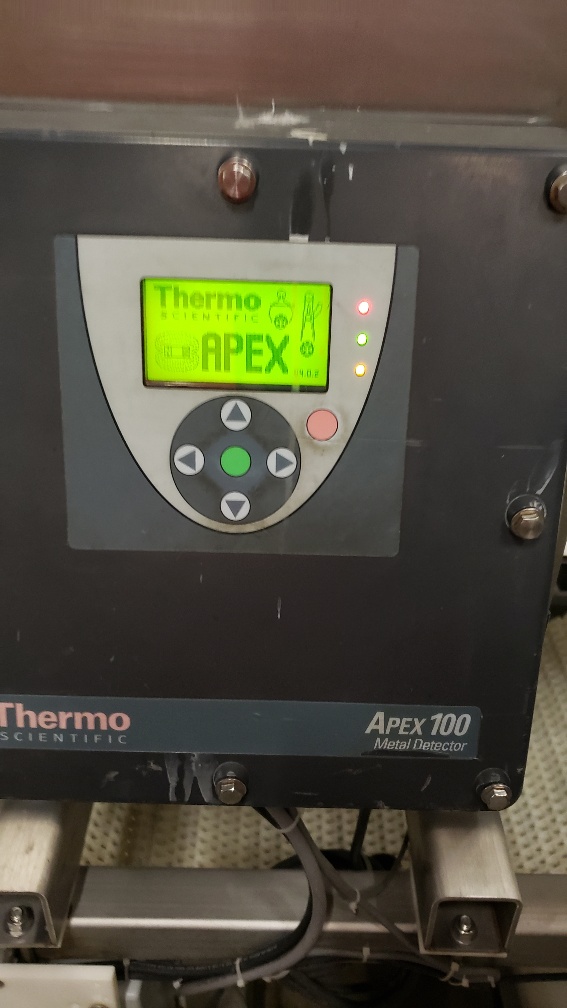 Used Thermo Fisher Scientific APEX 100 Metal Detector, with 19.75” X 14.25” Aperture, and 18” w X 5’-3″ Long Power Conveyor. Power: 120/220 VAC, 50/60 Hz, AMPS 0.40