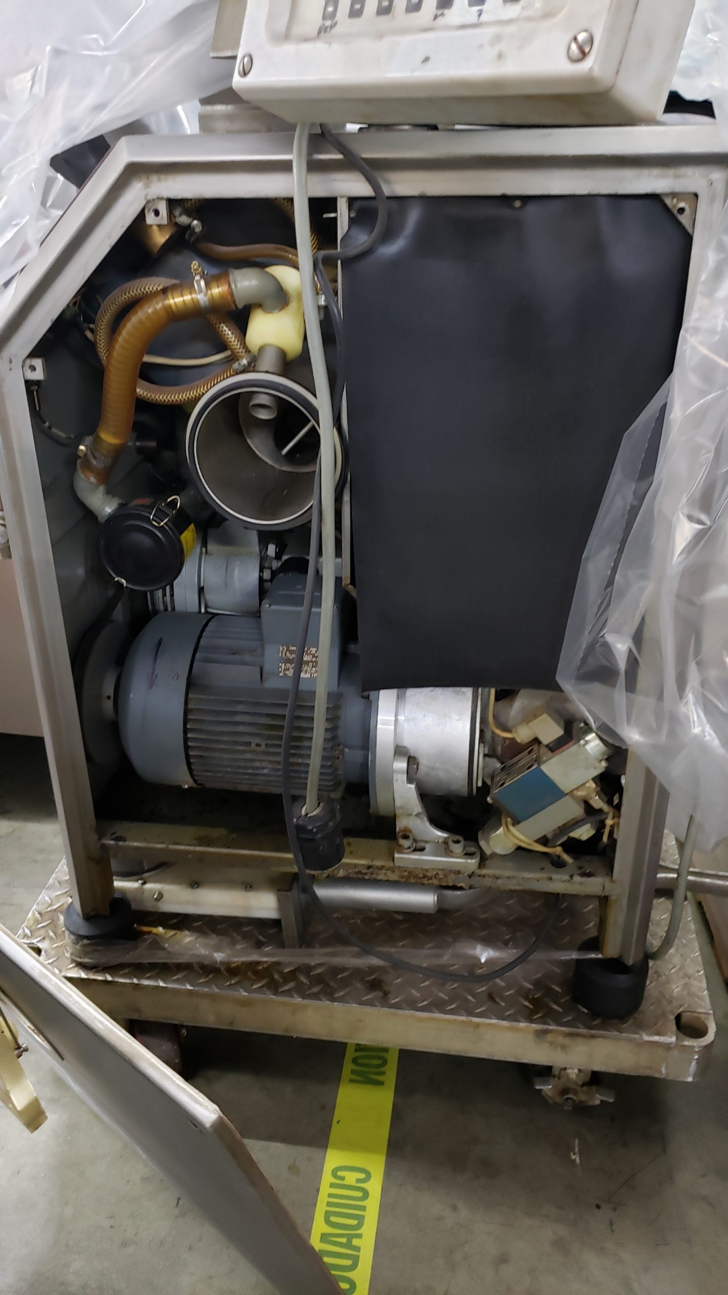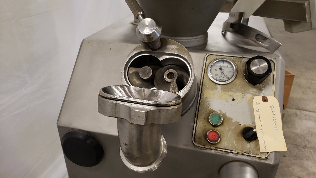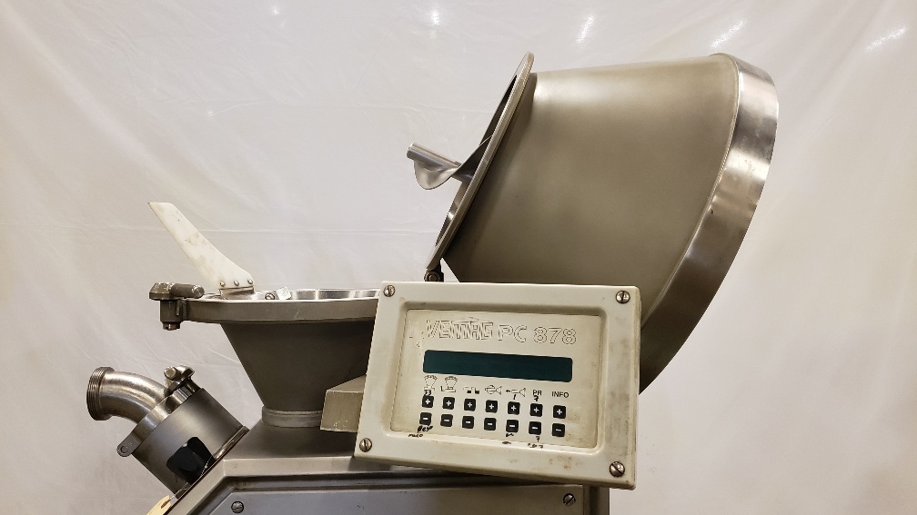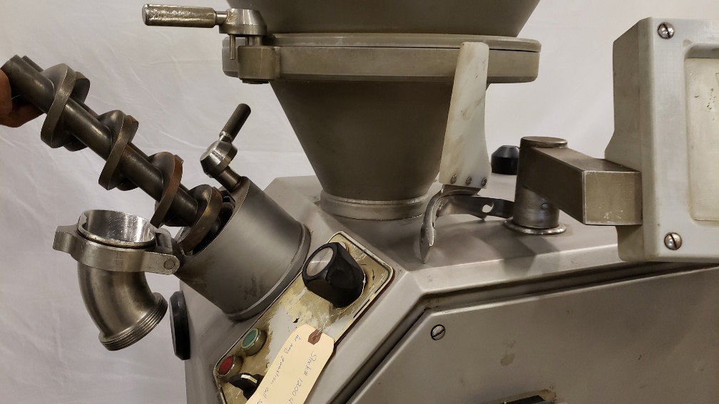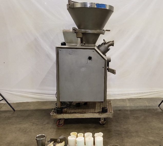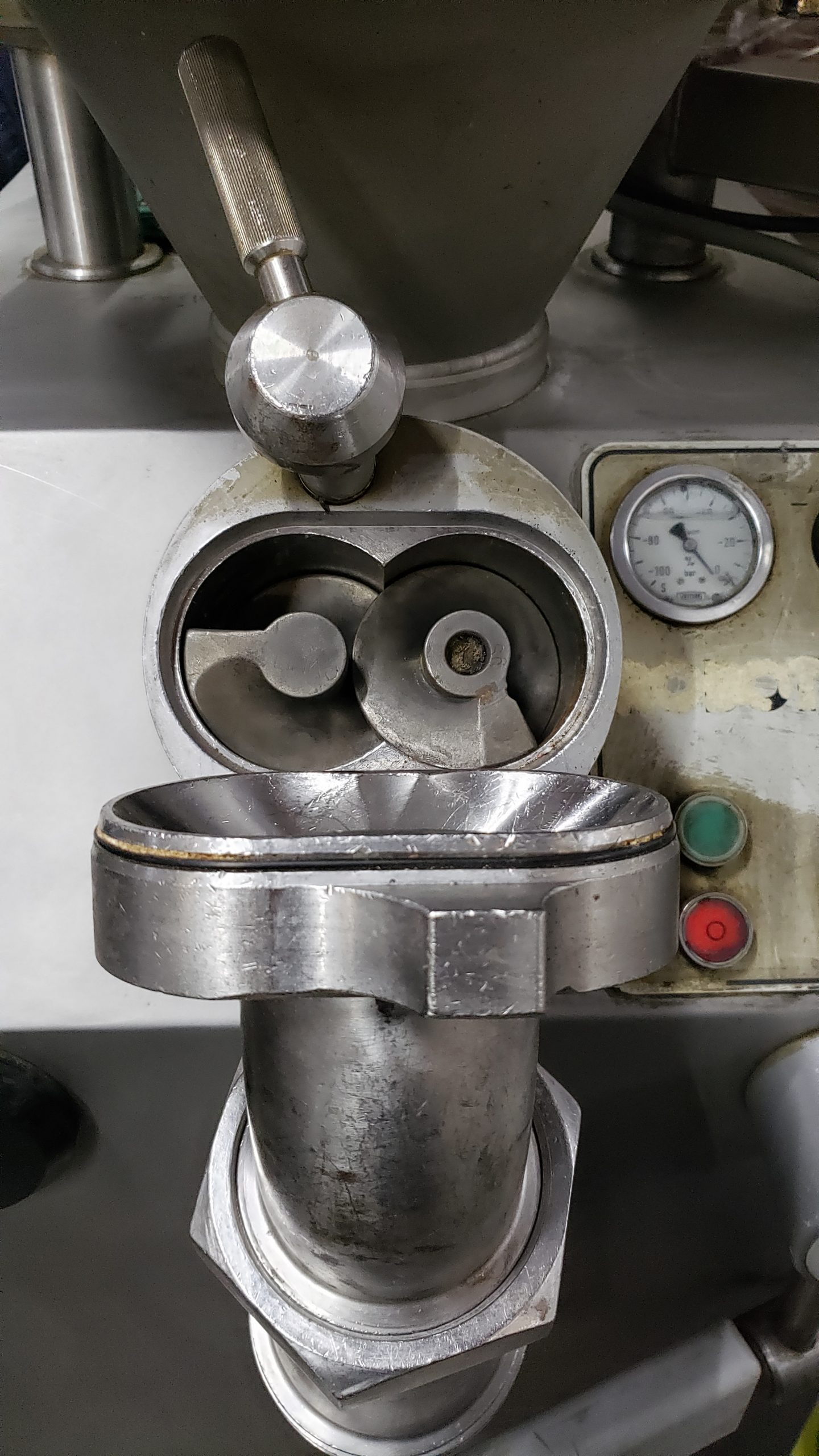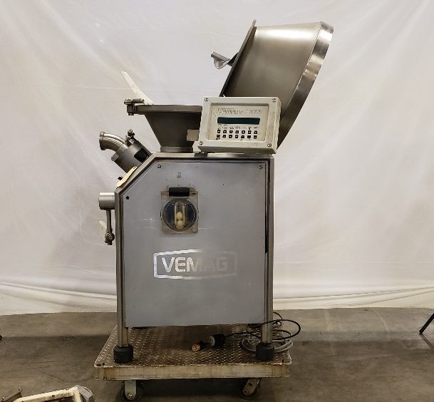 Vemag Robot 500 Vacuum Filler, Type 128/230 PC 878 Touch control, 26 in. diameter x 22 in. deep hopper, agitator, twin-screw, air-operated guillotine cutter, and 7 different UHMW formers tips.