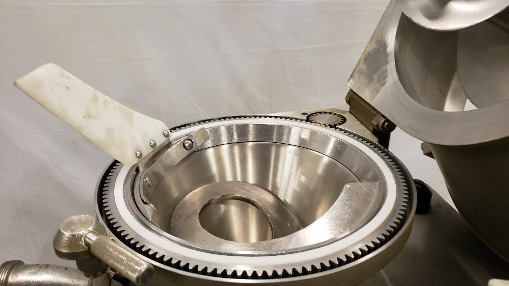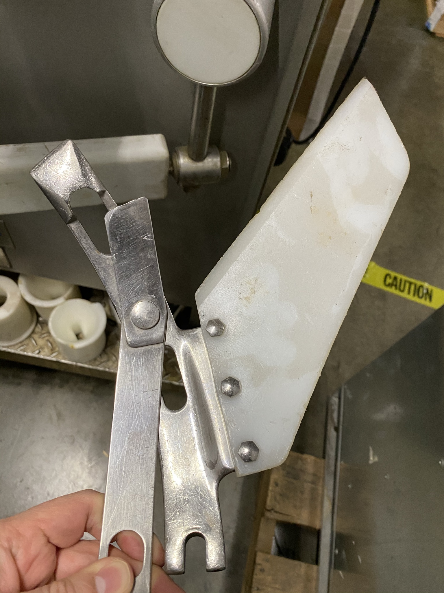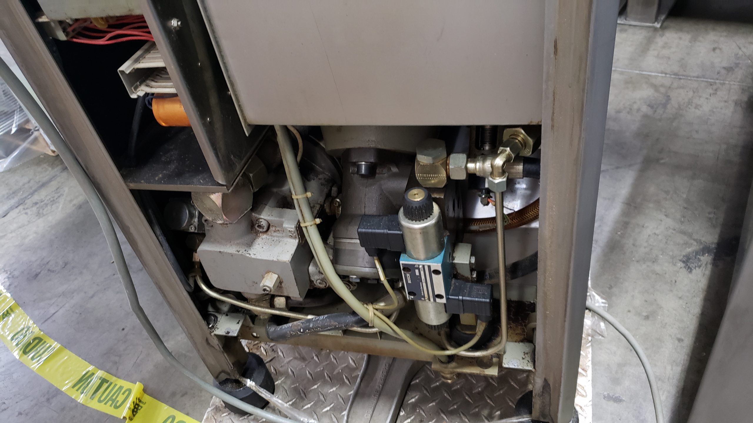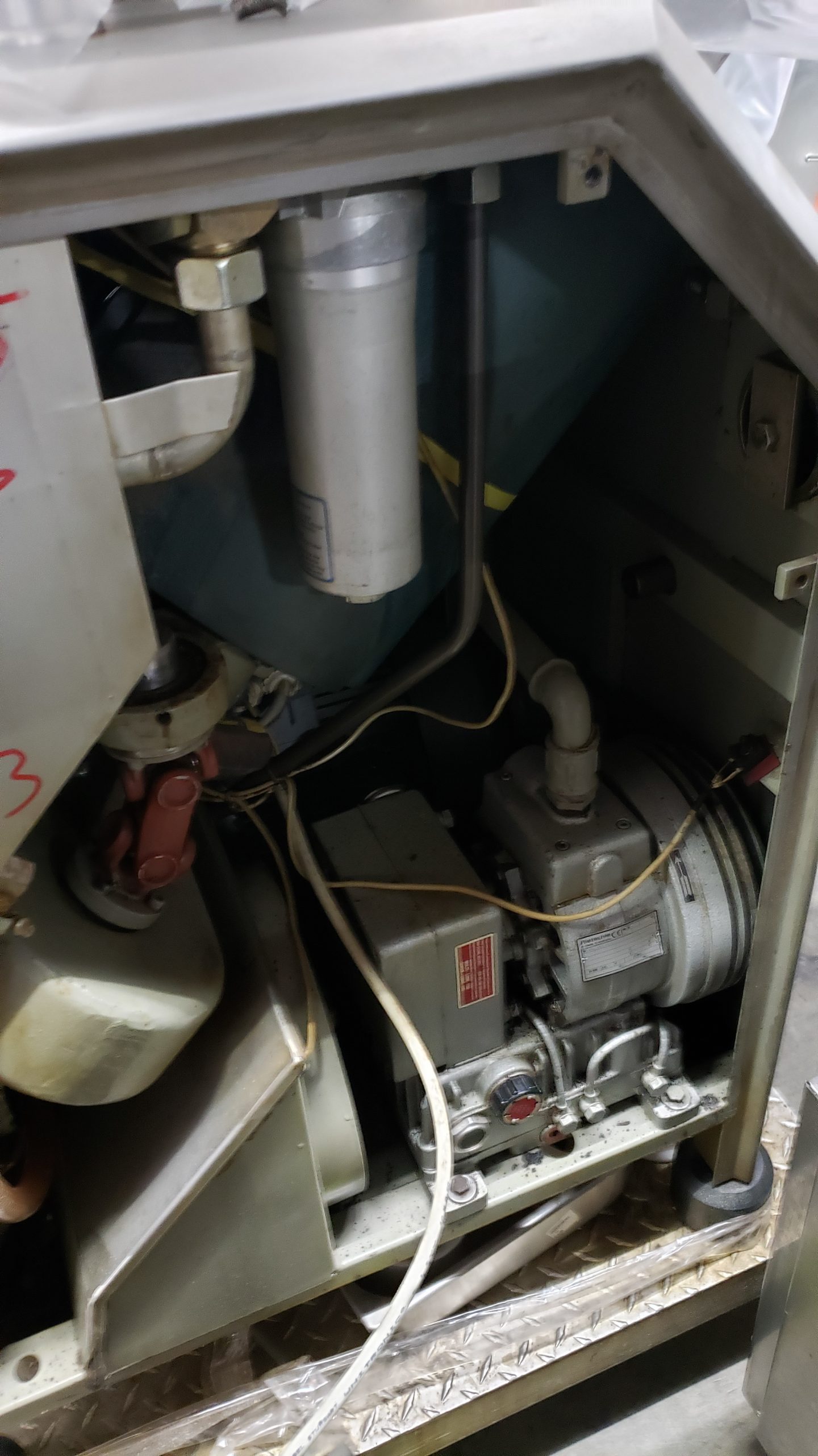 Vemag Robot 500 Vacuum Filler, Type 128/230 PC 878 Touch control, 26 in. diameter x 22 in. deep hopper, agitator, twin-screw, air-operated guillotine cutter, and 7 different UHMW formers tips.