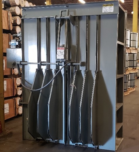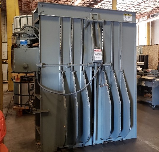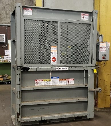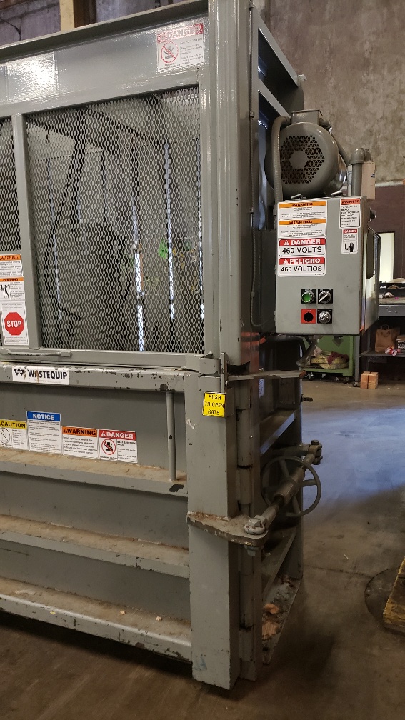 Used 2015 Wastequip vertical bailer model 6030HD. The hydraulic mass lowers down for shipping, and the stop switch is missing.